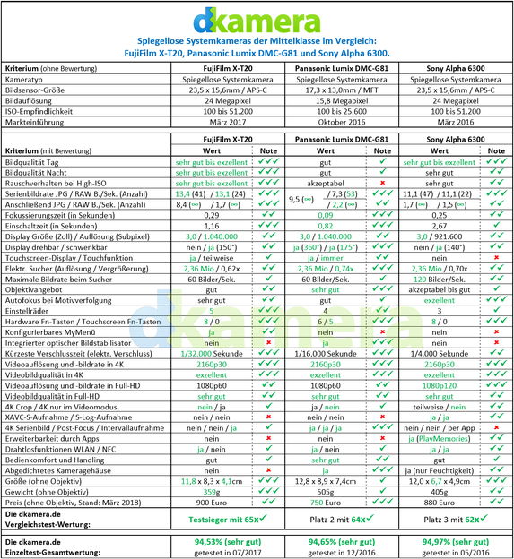 Kameras der Mittelklasse sind heutzutage trotz günstiger Preise sehr gut ausgestattet. Neben vielen Fotofeatures kommen dabei auch die Videofunktionen nicht zu kurz. Wir haben uns drei spiegellose Modelle der Mittelklasse ins Testlabor geholt und vergleichen diese in allen relevanten Kriterien. Es treten an: Die Panasonic Lumix DMC-G81, die Sony Alpha 6300 und die FujiFilm X-T20.