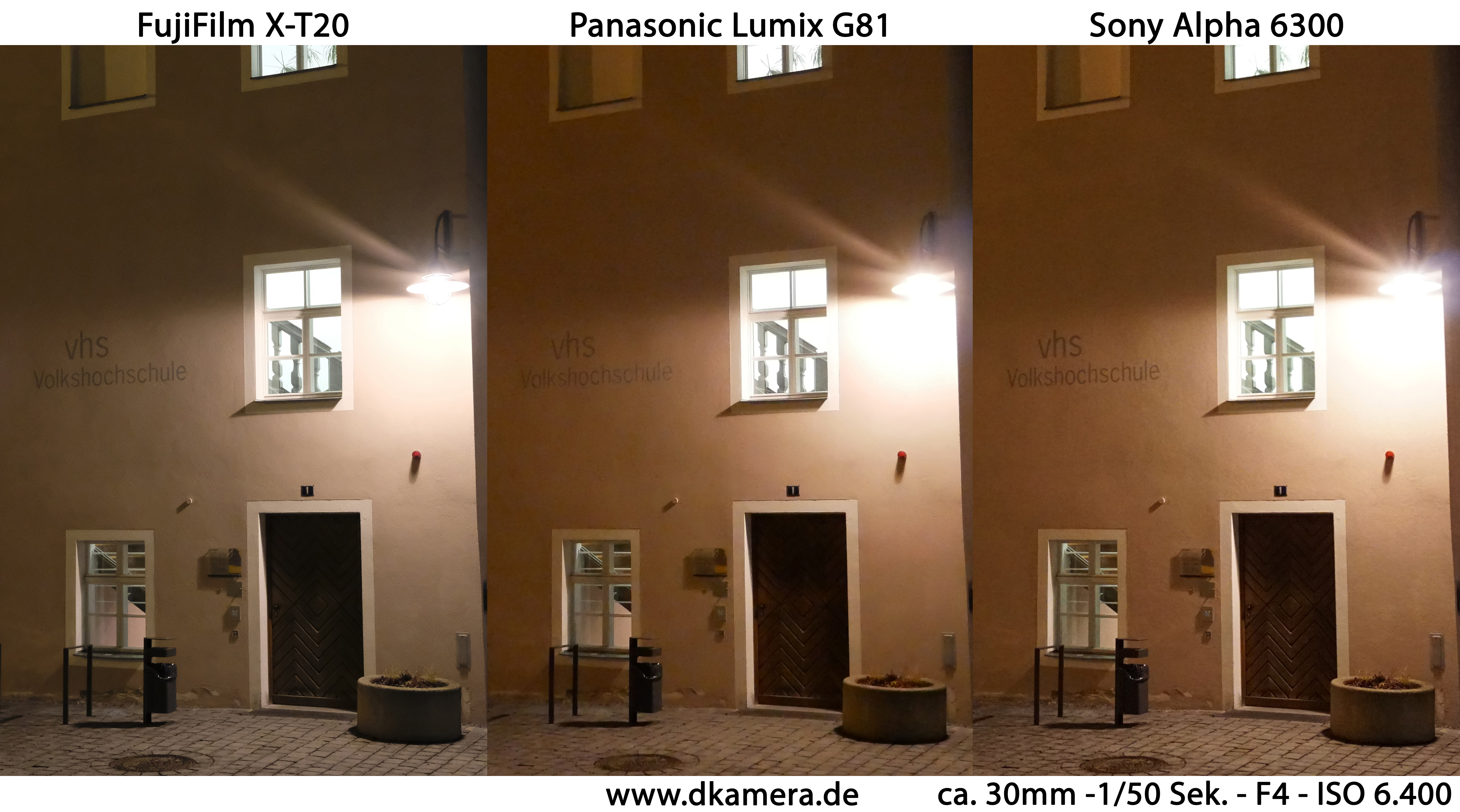 Bei Nacht werden höhere Sensorempfindlichkeiten notwendig, hier können die X-T20 und die Alpha 6300 vor allem den Vorteil des größeren Sensors ausspielen. Ihre Bilder zeigen im Vergleich zur G81 ein geringeres Bildrauschen, ISO 6.400 lassen sich ohne allzu große Abstriche nutzen.