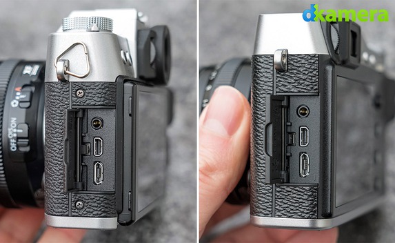 Die Kabelschnittstellen sind bei beiden Modellen hinter einer Klappe an der linken Seite zu finden. Ein 2,5mm-Klinkenport erlaubt den Anschluss eines externen Mikrofons oder einer Fernbedienung, über Micro-USB lässt sich die Verbindung zu einem Computer herstellen. Des Weiteren kann man die Kameras darüber aufladen. Die Ausgabe des Livebildes oder der auf der Speicherkarte befindlichen Dateien ist via Micro-HDMI realisierbar. Hier gibt es keinen Unterschied.