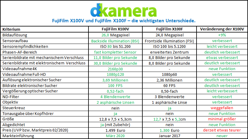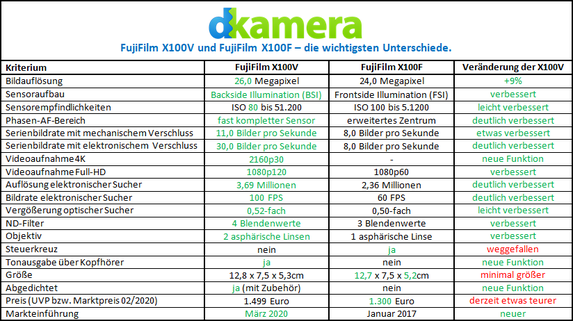 FujiFilm hat mit der X100V eine neue Kamera der X100-Serie vorgestellt. Die X100V ist das fünfte Modell der 2010 gestarteten Kamera-Reihe und wurde mit den aktuellsten Technologien von FujiFilm ausgerüstet. Wir vergleichen die neue Kompaktkamera mit dem Vorgängermodell und gehen auf alle wichtigen Verbesserungen bzw. Veränderungen ein.