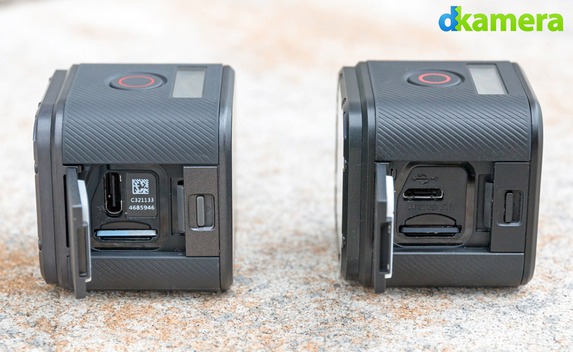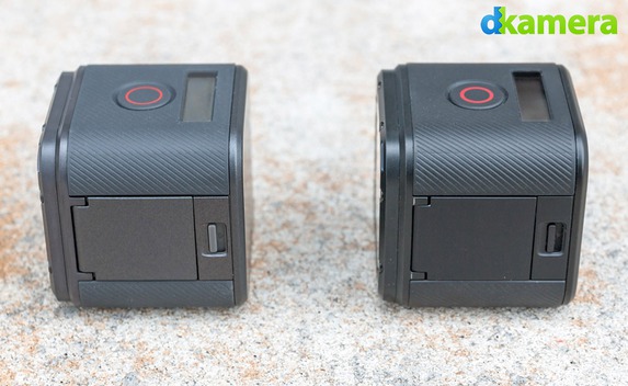 Die Vorderseite der jeweils sehr gut verarbeiteten Kameras besteht quasi nur aus dem bei Beschädigungen austauschbaren Objektiv-Schutzglas, an dessen Seiten liegen eine LED und das Mikrofon. Auf der Oberseite befinden sich jeweils der Auslöser und ein kleines monochromes LCD, an der linken Seitenfläche kann man eine Klappe öffnen. Das dahinter liegende Fach beherbergt den Speicherkartenslot und den USB-Port. Über den USB-Port, der bei der HERO4 Session als Micro-Variante und bei der HERO5 Session als Typ C ausgeführt ist, wird der fest verbaute Akku (1.030mAh) aufgeladen.