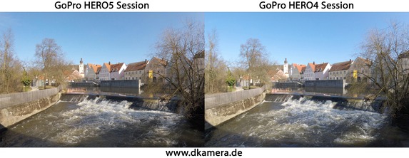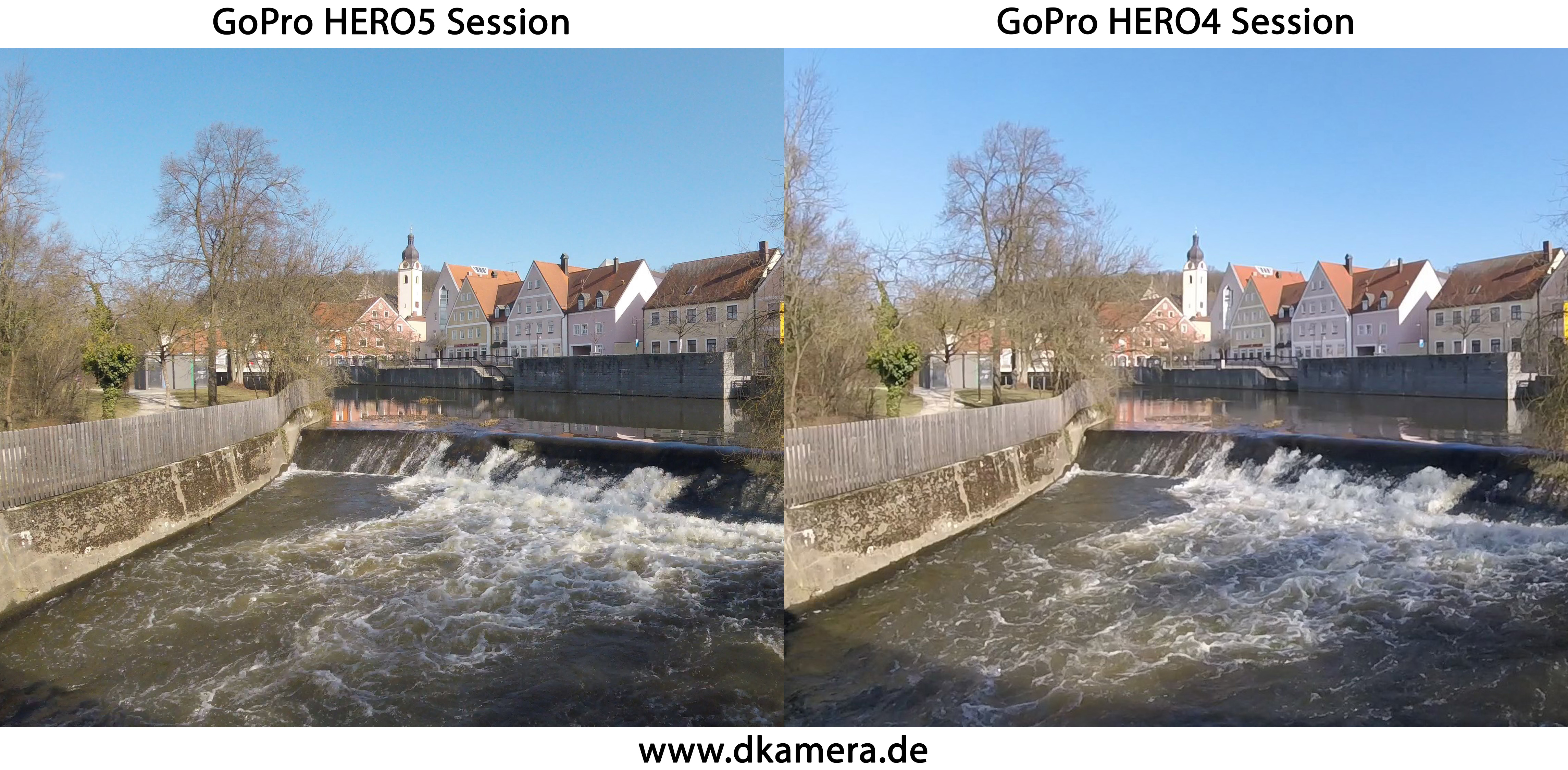 Die Aufnahme zum Vergleich der Videoqualität ist bei der HERO5 Session mit 4K-Auflösung (3.840 x 2.160 Pixel) und 30 Vollbildern pro Sekunde erfolgt, bei der GoPro HERO4 Session (Testbericht) mit Full-HD-Auflösung (1.920 x 1.080 Pixel) und 60 Vollbildern pro Sekunde.
