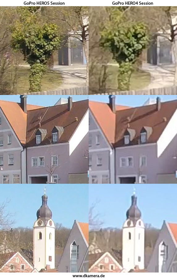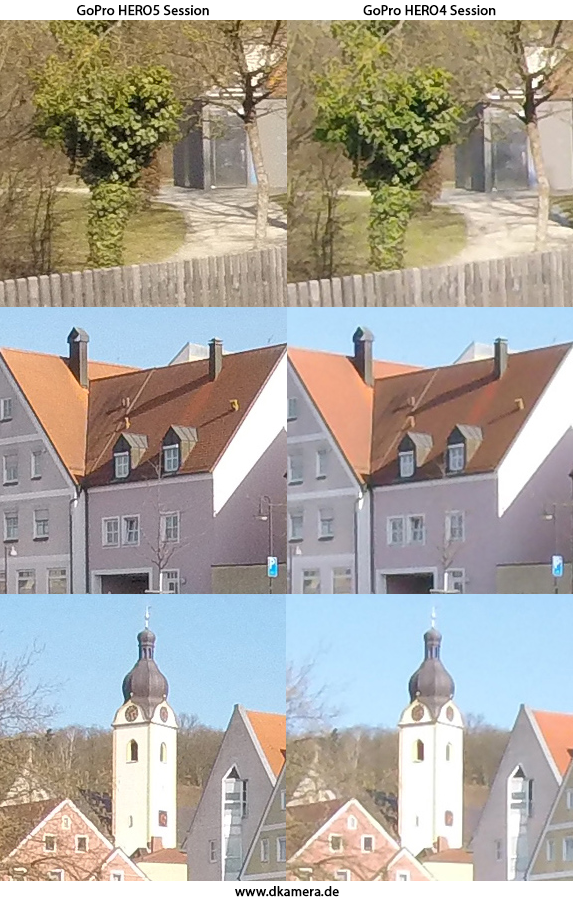 Zum Vergleich der Foto-Bildqualität haben wir mit beiden Kameras ein Vergleichsbild bei der jeweils höchstmöglichen Auflösung und dem Bildfeld „weit“ sowie bei Standardeinstellungen aufgenommen. Während die GoPro HERO5 Session Fotos mit zehn Megapixel speichert, sind es bei der HERO4 Session nur acht Megapixel. Dies macht sich bei der Detailwiedergabe bemerkbar, die HERO5 Session kann feine Details deutlich besser wiedergeben. Dies liegt allerdings auch an der starken kamerainternen Nachschärfung der HERO5 Session. Sie sorgt für ein sichtbares Rauschen. Insgesamt wissen die Aufnahmen der HERO5 Session trotzdem mehr zu gefallen.