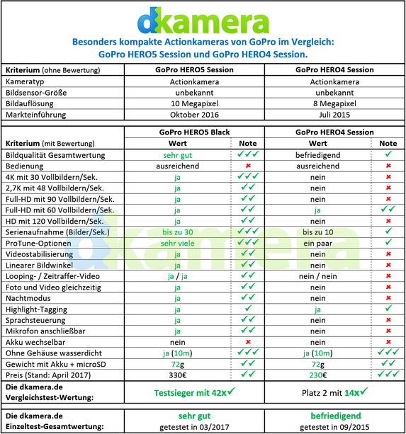 Mit den HERO Session-Modellen bietet GoPro Actionkameras an, die auf besonders kleine Abmessungen optimiert wurden. Trotzdem sollen die Kameras mit einer guten Bildqualität überzeugen können, bei den Gehäusen sind zudem die vorhandenen Abdichtungen zu erwähnen. Diese erlauben den Unterwassereinsatz ohne Schutzgehäuse. Wir haben die beiden aktuell erhältlichen HERO-Session-Kameras gegenübergestellt.
