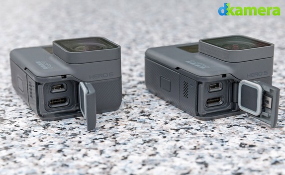 Beide Actionkameragehäuse messen 6,2 x 4,5 x 3,3cm, jenes Gehäuse der HERO6 Black fällt allerdings minimal leichter aus (114g statt 117g). Die Oberfläche der Gehäuse besteht aus einer Gummierung, dadurch kann man beide Kameras sicher festhalten. Auch die Tasten und Schnittstellen befinden sich an den identischen Stellen: Der Auslöser liegt auf der Oberseite, die Mode-Taste an der einen und die Schnittstellen an der anderen Seitenfläche. Per Kabel erlauben beide Modelle die Ausgabe eines Bildes über Micro-HDMI, per USB-C wird der Akku jeweils kameraintern aufgeladen. Dieser befindet sich zusammen mit der microSD-Speicherkarte in einem Fach auf der Unterseite. Daher gilt: Beide Actionkameras sind zum gleichen Zubehör kompatibel.