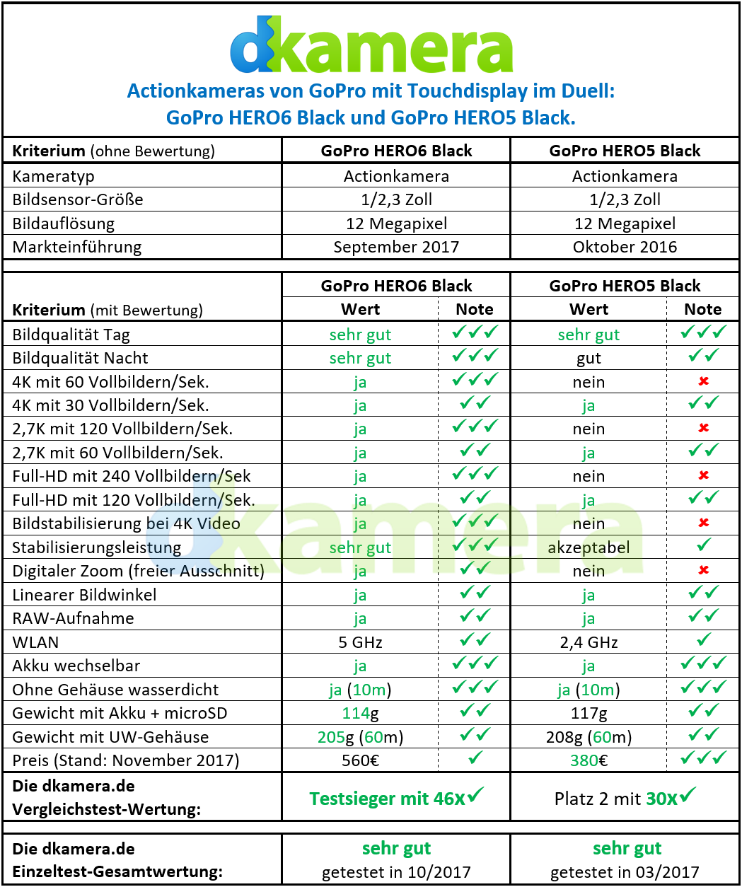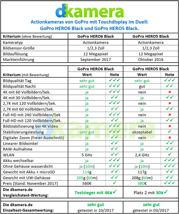 Mit der HERO6 Black (Testbericht) hat GoPro im Herbst 2017 das Nachfolgemodell der zur Photokina 2016 angekündigten GoPro HERO5 Black (Testbericht) vorgestellt. Die neue Actionkamera setzt sich vom Vorgängermodell vor allem mit deutlich höheren Bildraten ab, das Gehäuse hat man nicht verändert. Wir gehen im folgenden Vergleichstest auf die Unterschiede zwischen beiden Modellen ein.