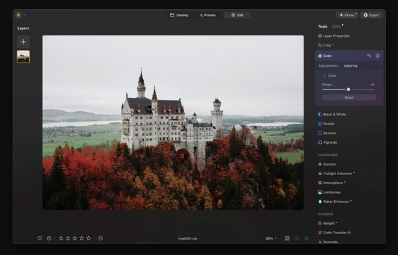 Zum einen umfasst das Update die neue Funktion „Farbübertragung“. Diese erlaubt, Farben von einem Referenzbild auf eigene Fotos zu übertragen. Für die optimale Farbangleichung soll die KI sorgen, Anpassungen können zudem per Schieberegler vorgenommen werden. Dadurch sollen Fotografen unter anderem Bilder mit dem Look bekannter Fotos erstellen können.