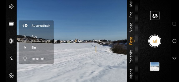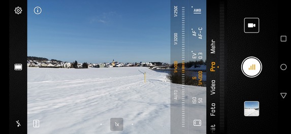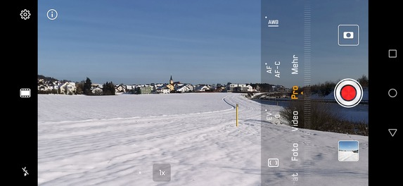 Die Wahl der Kamera erfolgt in der App über die seitlich angezeigten Touchtasten. Das Kürzel „Weit“ steht für die Weitwinkelkamera, „1x“ für die Hauptkamera und „3x“ für die Telekamera, das Wechseln geht ausgesprochen schnell. Die Kamera lässt sich im normalen Fotomodus allerdings nur wechseln, wenn man sich bei Fotos der Hauptkamera für maximal 10 Megapixel entschieden hat. Diese Einschränkung ergibt wenig Sinn und ist im Pro-Modus glücklicherweise nicht vorhanden.