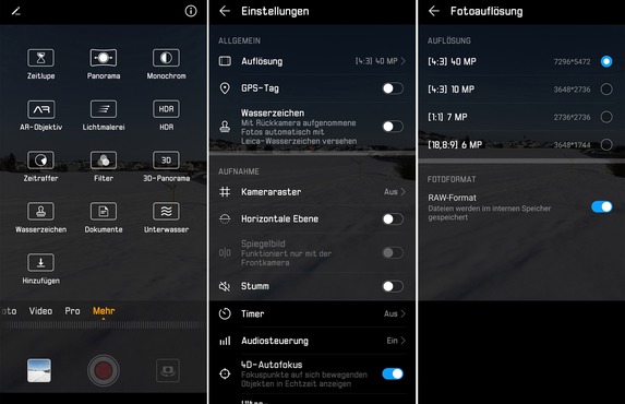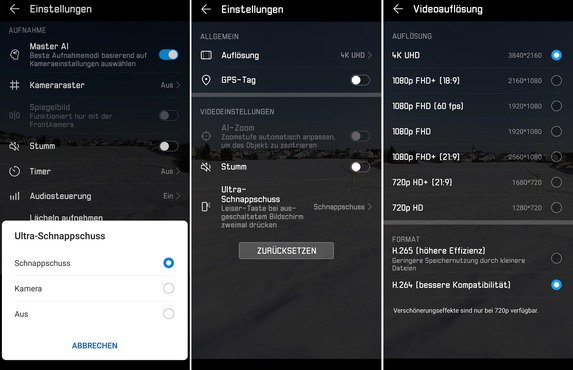 Abzüge gibt es auch für die Tonqualität, teilweise klingen die Audioaufnahmen bei Videos sehr unnatürlich. Des Weiteren hätten wir uns bei einem Spitzenmodell 60 Vollbilder pro Sekunde in 4K gewünscht. Die App bietet viele Optionen und ist trotzdem übersichtlich gestaltet.