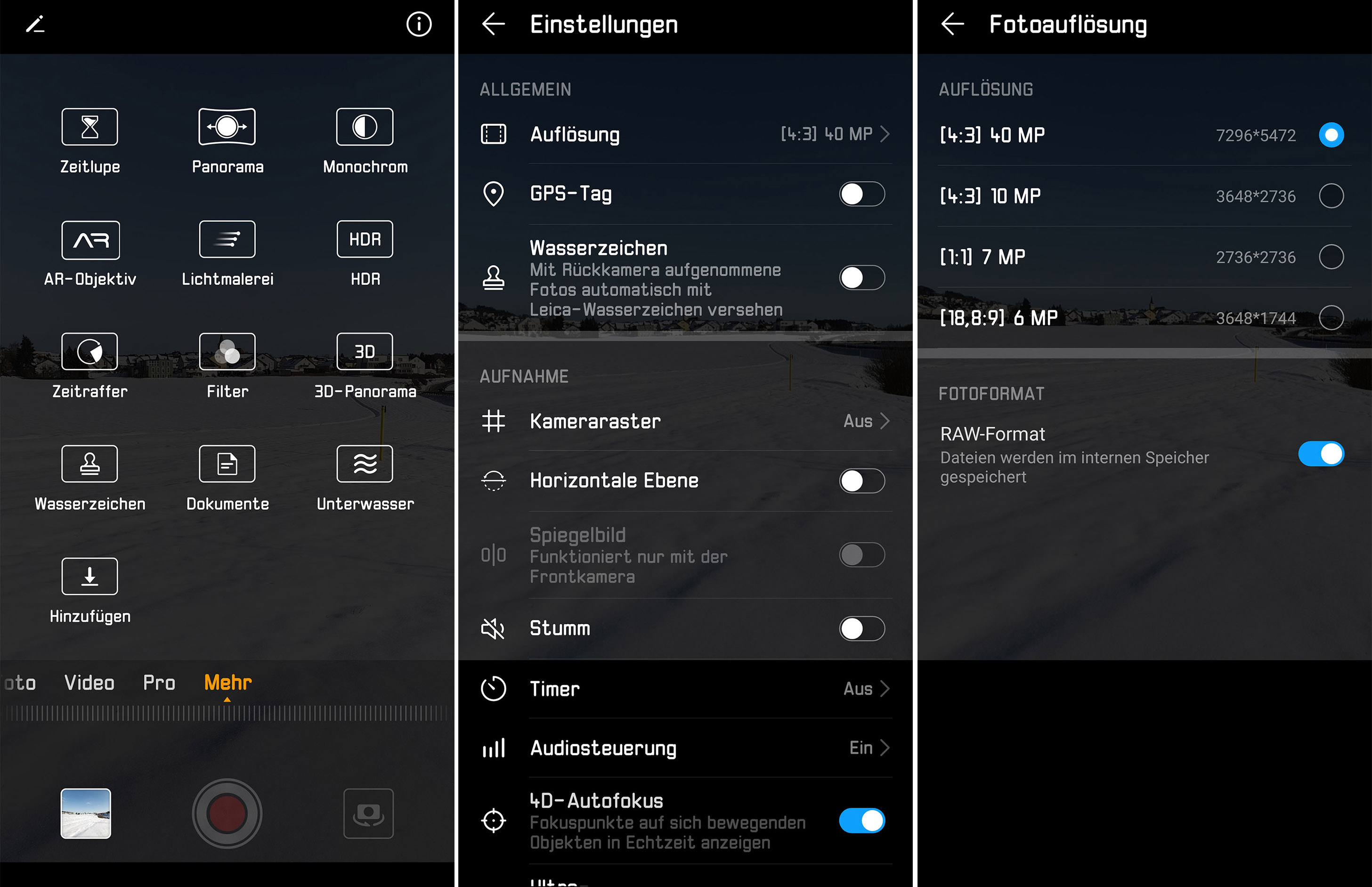 Der Pro-Modus für Fotoaufnahmen erlaubt diverse weitere Einstellungen:
