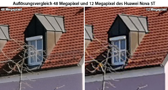 Standardmäßig erfolgt die Bildausgabe beim Huawei Nova 5T mit 12 Megapixel, in der App lässt sich jedoch auch die native Auflösung des Sensors einstellen. Spezielle Phasen-AF-Pixel wurden auf dem Sensor zum schnelleren Fokussieren untergebracht, des Weiteren wird die Kontrastmessung unterstützt. Es handelt sich also um einen Hybrid-AF. Das Objektiv der Hauptkamera besitzt eine kleinbildäquivalente Brennweite von 28mm, die Lichtstärke liegt bei F1,8. Die Bildstabilisierung erfolgt rein elektronisch, einen OIS gibt es nicht.