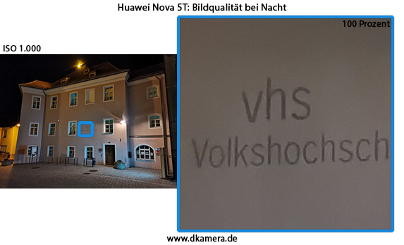 Bei Nacht liefert die Hauptkamera im Regelfall gute Ergebnisse. Mit den Flaggschiff-Geräten kommt das Nova 5T zwar nicht mit, die Aufnahmen sind aber doch sehr ordentlich. Bis zu ISO 400 sind in der Regel ohne größere Probleme nutzbar, ISO 800 sollte man dagegen besser nicht überschreiten. Für Aufnahmen bei sehr wenig Licht steht der spezielle Nachtmodus zur Verfügung, damit lassen sich – sofern es sich um ein statisches Motiv handelt – ansehnliche Bilder aufnehmen. Das Autofokussystem der Hauptkamera arbeitet flott, die elektronische Stabilisierung sorgt im Regelfall für scharfe Fotos. Eine optische Stabilisierung wäre trotzdem schön gewesen.