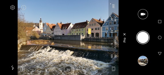 Rechts vom Livebild werden das Aufnahmeprogramm bestimmt, wählen Fotografen zwischen der Front- und den Rückseitenkameras, können auslösen und den Wiedergabemodus aufrufen. Fünf Aufnahmemodi (AR-Objektiv, Nacht, Porträt, Foto und Video) lassen sich direkt erreichen, zwölf weitere sind über „Mehr“ ansteuerbar.