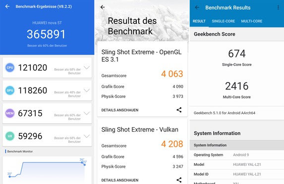 Unsere Benchmarks bestätigen den Praxiseindruck. Im Antutu-System-Benchmark erreicht das Huawei Nova 5T sehr ordentliche 365.891 Punkte, im Geekbench 5 sind es 674 Single-Core und 2.416 Multi-Core-Punkte und beim PC Mark Work 2.0-Test ergaben sich 7.826 Punkte. Der interne Speicher bewegt sich mit 836MB/s beim Lesen und 195MB/s beim Schreiben auf einem guten bis sehr guten Niveau. Ebenso beachtlich: Der 3.750mAh starke Akku reicht für rund zwölf Stunden Videowiedergabe.