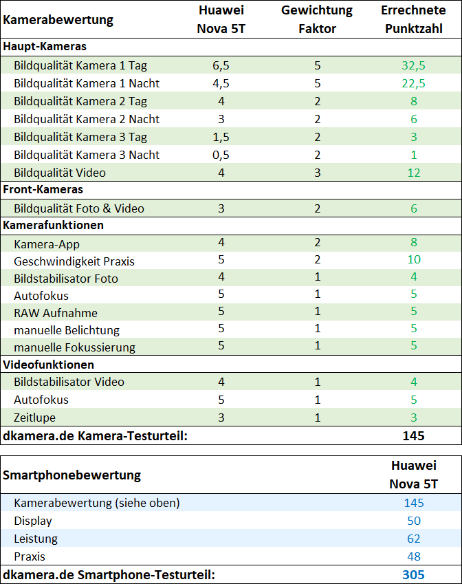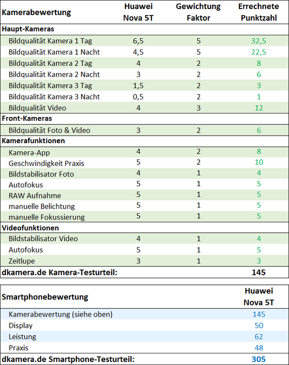 In puncto Kameras liefert das Huawei Nova 5T eine sehr solide Performance ab. Wer an seine Smartphone-Kameras durchschnittliche bis leicht gehobene Ansprüche hat, macht mit dem Gerät nichts falsch. Die Hauptkamera liefert bei Tag gute bis sehr gute Bilder, bei Nacht immer noch gute. Die Ultraweitwinkelkamera erreicht bei Tag ein ordentliches bis gutes Qualitätsniveau, bei Nacht ein akzeptables. Dank des Nachtmodus muss man das Smartphone selbst bei richtig schlechten Lichtverhältnissen nicht in der Tasche lassen, sondern kann Fotos aufnehmen.