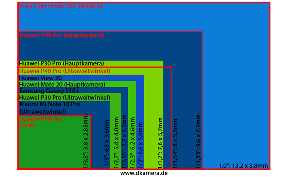 Zum verbauten Sensor macht Huawei keine weiteren Angaben als die Auflösung, diese soll bei 12 Megapixel liegen. Die Bilder werden mit 12,6 Megapixel ausgegeben, ob dies der realen Sensorauflösung entspricht, ist jedoch nicht gesichert. Da sich die Sensorgröße den offiziellen Datenblättern nicht entnehmen lässt, können wir sie nur schätzen. Anhand der in den Exif-Daten genannten realen Brennweite von 14mm und der Brennweitenangabe von Huawei sollte der Sensor in etwa 1/3,8 Zoll groß sein. Das ist für eine Telekamera durchaus ordentlich, wenngleich der Chip im Vergleich zu den anderen Sensoren des P40 Pro natürlich sehr klein ausfällt.