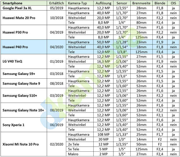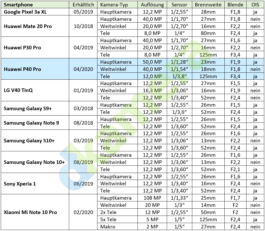 Huawei setzt auf der Rückseite auf ein Triple-Kamera-Setup, wie schon bei den Vorgängermodellen wurde dieses in Zusammenarbeit mit Leica entwickelt. Der Name lautet daher „Leica Vario-Summilux-H 18-125mm F1,8-F3,4“. Um ein echtes Zoomobjektiv handelt es sich allerdings nicht, stattdessen kommen drei Festbrennweiten zum Einsatz. Bei der Hauptkamera, die über einen optischen Bildstabilisator (OIS) verfügt, setzt Huawei auf ein Objektiv mit 23mm KB-Brennweite und einer Lichtstärke von F1,9. Ersterer Wert ist für eine Hauptkamera vergleichsweise kurz, die Blende fällt dagegen etwas kleiner als üblich aus. Der Grund für Ersteres ist uns nicht bekannt, die etwas geringere Lichtstärke dürfte mit der Sensorgröße des zum Einsatz kommenden Chips zusammenhängen. Dieser ist so groß wie bei keinem Smartphone der letzten Jahre. Huawei gibt ihn mit 1/1,28 Zoll an, durch einen RYYB-Farbfilter (Gelb statt Grün) soll eine bessere Lichtempfindlichkeit erzielt werden. Auf dem Sensor hat Huawei rund 50 Megapixel untergebracht, standardmäßig erfolgt die Ausgabe der Fotos mit knapp 12,6 Megapixel. Der Sensor verfügt wie mittlerweile üblich im Smartphone-Segment über eine Quad-Bayer-Filtermatrix, vier Pixel lassen sich dadurch sehr einfach zu einem „großen“ Bildpunkt zusammenfassen. In diesem Fall misst ein Pixel 2,44μm. Zu den weiteren Features der Hauptkamera gehören beim P40 Pro ein Octa-Phasendetektion-Autofokus und eine maximale Sensorempfindlichkeit von ISO 409.600.