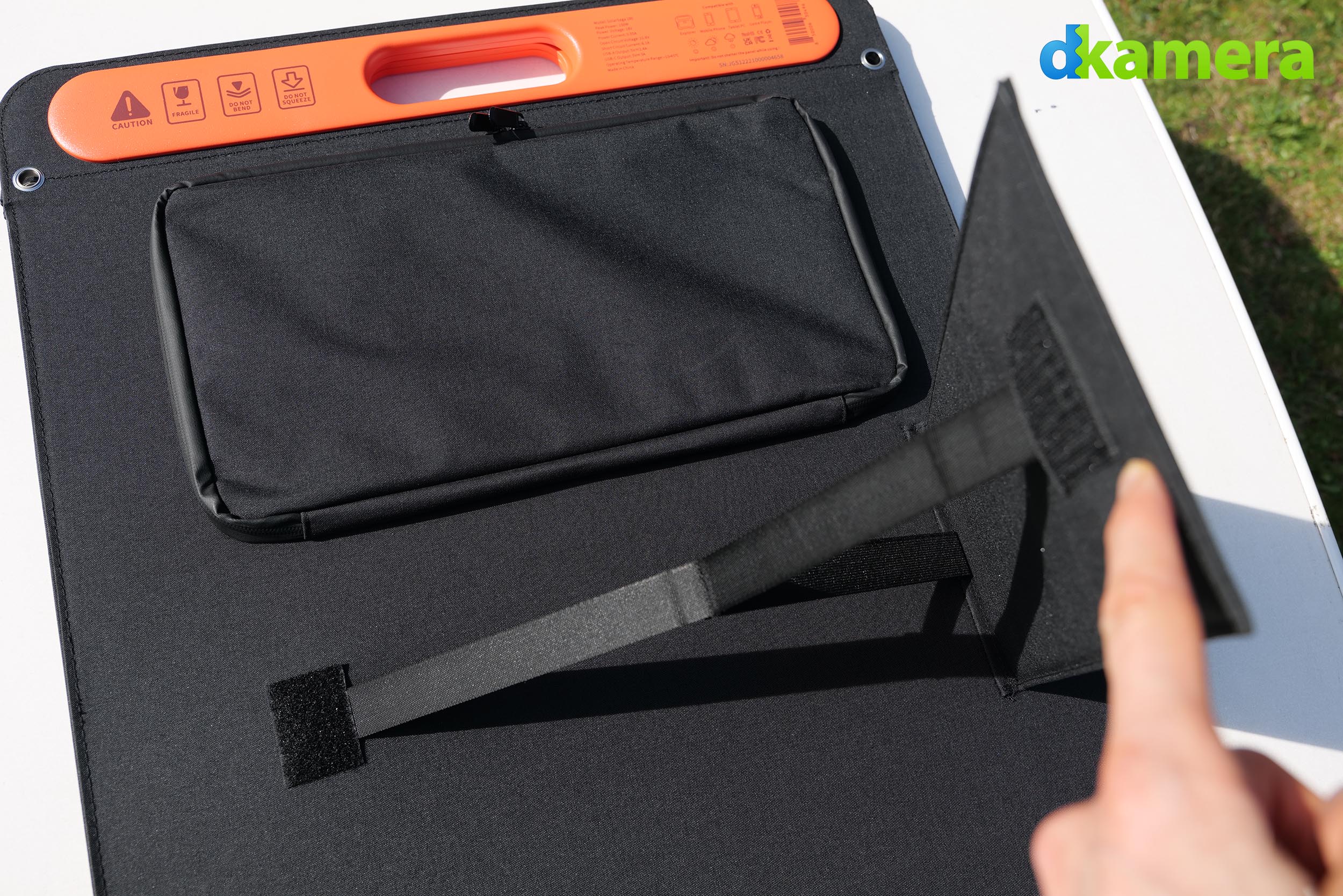 Auf der Rückseite jedes Solarpanels befindet sich auf einer Seite eine nach IP65 spritzwassergeschützte Reißverschlusstasche, auf dessen Inhalt wir im Anschluss noch genauer eingehen werden.