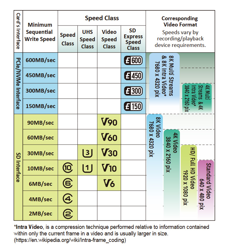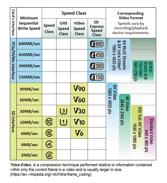 Seit 2006 gibt es mit der (Video) Speed Class auch eine Unterstützung für Videografen: Die Angaben „Classxx“, „Vxx“ oder „Exx“ informieren über die Schreibgeschwindigkeit, die eine Speicherkarte jederzeit erreicht. Dadurch kann man das Abbrechen von Videoaufnahmen durch eine zu langsame Speicherkarte verhindern. Alle anderen auf Speicherkarten zu findenden Geschwindigkeitswerte stellen dagegen in aller Regel Maximalwerte dar, die nicht jederzeit erzielt werden.