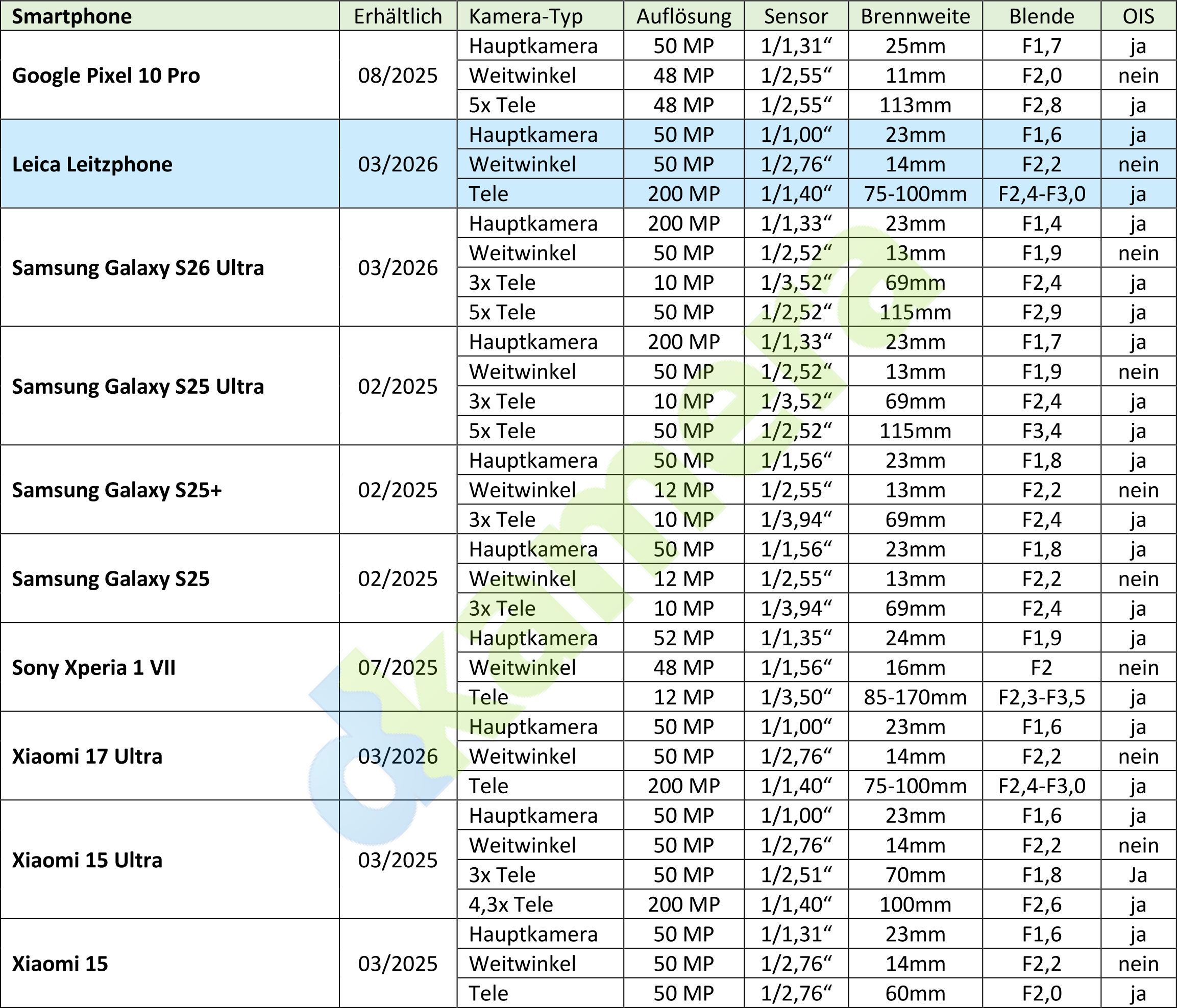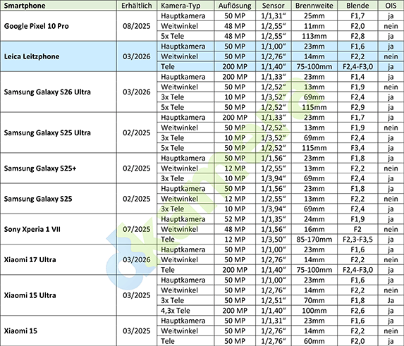 Das Leica Leitzphone powered by Xiaomi basiert auf dem Xiaomi 17 Ultra, das als Flaggschiff der diesjährigen Smartphones von Xiaomi natürlich mit den besten Kameras ausgerüstet ist. Neben der Frontkamera verfügt das Leitzphone über drei Rückseitenkameras. Letztere werden als Leica Vario-APO-Summilux 14-100mm F1,67-2,9 Asph. zusammengefasst. Wie üblich gilt es bei dieser Angabe jedoch zu beachten, dass es sich nicht um ein durchgehendes optisches Zoom handelt. Ein Teil der Brennweite wird allerdings tatsächlich per optischem Zoom abgedeckt.