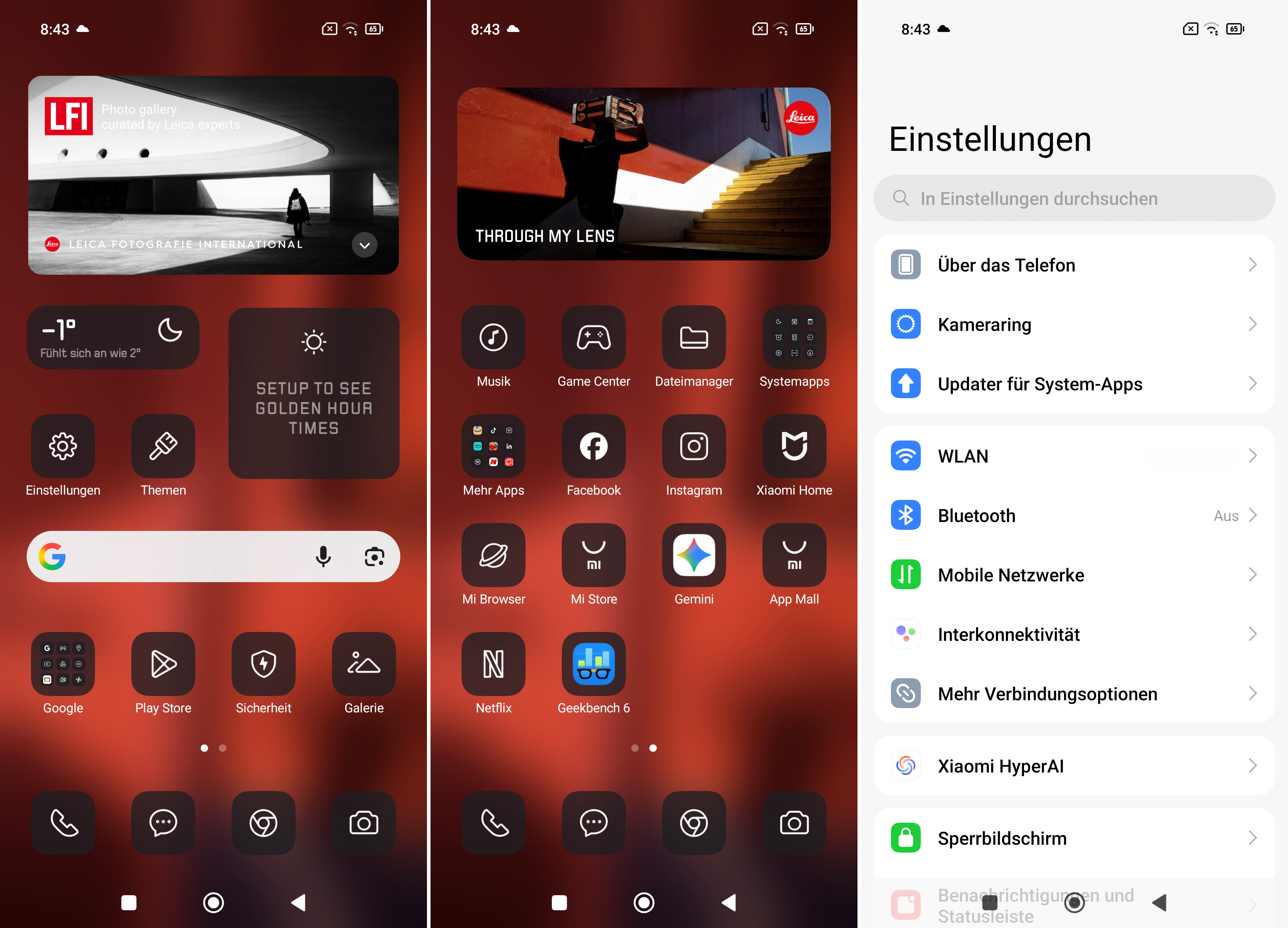 Die Android-Oberfläche des Leica Leitzphone powered by Xiaomi wirkt im Vergleich mit dem Smartphone von Xiaomi weniger aufdringlich. Angelehnt ist das Design an die Menüs von Leica, das gilt allerdings nur für die „oberste“ Ebene. In „tieferen“ Menüstrukturen bekommt man das klassische Xiaomi-Design zu Gesicht. Das finden wir doch etwas schade, umfangreichere Veränderungen wären schöner gewesen. Diese Umsetzung hätte aber sicherlich deutlich mehr Aufwand bereitet. Dass Leica als Betriebssystem HyperOS 3 von Xiaomi nutzt, hat aber natürlich auch Vorteile. OS-Updates soll es mindestens fünf Jahre lang geben und Sicherheitsupdates sogar für sechs Jahre.