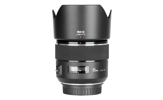 Das Meike MK 85mm F1.8 mit der mitgelieferten Gegenlichtblende: