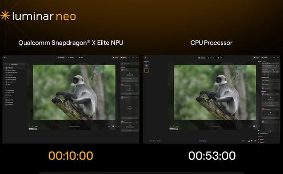 Bildbearbeitungen sollen laut Skylum durch die NPU der Qualcomms Snapdragon X Elite und X Plus-CPUs bis zu 200 Mal schneller erfolgen, umfangreiche Berechnungen nehmen daher deutlich weniger Zeit in Anspruch. In der Praxis sollten Aufgaben zwar nur im Extremfall so stark durch die Neural Processing Unit beschleunigt werden können, in einem Anwendungsbeispiel mit der Hochskalieren AI fällt der Abstand mit 10 Sekunden gegenüber 53 Sekunden (klassische CPU) jedoch sehr deutlich aus.