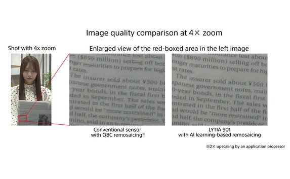 Hierfür nutzt Sony eine „Quad-Quad-Bayer“-Struktur, die pro 4x4-Pixelraster auf den identischen Farbfilter setzt. Dieses Verfahren ist von vielen aktuellen Smartphone-Sensoren bekannt und verbindet die Vorteile von Sensoren mit großen Bildpunkten sowie von Sensoren mit vielen Pixeln. Damit die Bildqualität auch bei Aufnahmen mit voller Sensorauflösung möglichst hoch ausfällt, hat Sony einen Remosaicing-Prozess (Array-Konvertierung vom „Quad-Quad Bayer“-Array zum „Single-Pixel“-Array) entwickelt, der künstliche Intelligenz auf Sensorebene nutzt. Dieses Vorgehen sorgt laut Sony für eine bessere Bildqualität, da hochfrequente Signale besser reproduziert werden können. Da der Sensor die Daten selbst verarbeitet, sind zudem bis zu vierfache Zooms in 4K-Auflösung (mit bis zu 30 Vollbildern pro Sekunde) möglich.