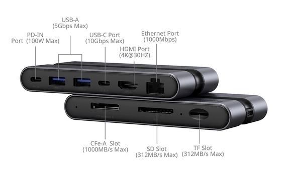 Für Foto- und Videografen bringt die 9-in-1-CFexpress-Fotografie-Dockingstation zudem drei Speicherkartenslots mit. Hier kann man sich abhängig vom Modell zwischen einem CFexpress Typ-A-Slot oder einem CFexpress Typ-B-Slot entscheiden. Stets verbaut sind jeweils ein SD- sowie ein microSD-Slot. Bei den SD- und microSD-Slots ist die Datenübertragung dank UHS-II-Schnittstelle mit bis zu 312MB/s möglich, die CFexpress-Slots werden mit 1GB/s angegeben. Die Docking-Station selbst wird per USB 3.2 Gen 2-Port mit dem Notebook verbunden, dieser ermöglicht den Datenaustausch mit 10Gbit/s.