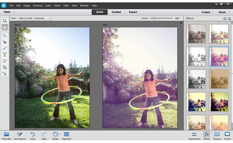 Im Bereich der Bildbearbeitung bietet Adobe Photoshop Elements 12 nun erstmals inhaltssensitives Verschieben an. Diese Funktion erlaubt es, einzelne Objekte im Bild nach Belieben neu zu platzieren. Die Software füllt die dabei entstehenden Leerstellen mit neuem Inhalt, berechnet anhand der umliegenden Bildbereiche. Die gleiche Technik nutzt Photoshop Elements 12 zum Füllen leerer Eck- und Kantenbereiche in Bildern, die mit dem Perspektivkorrektur-Tool geradegerückt wurden.