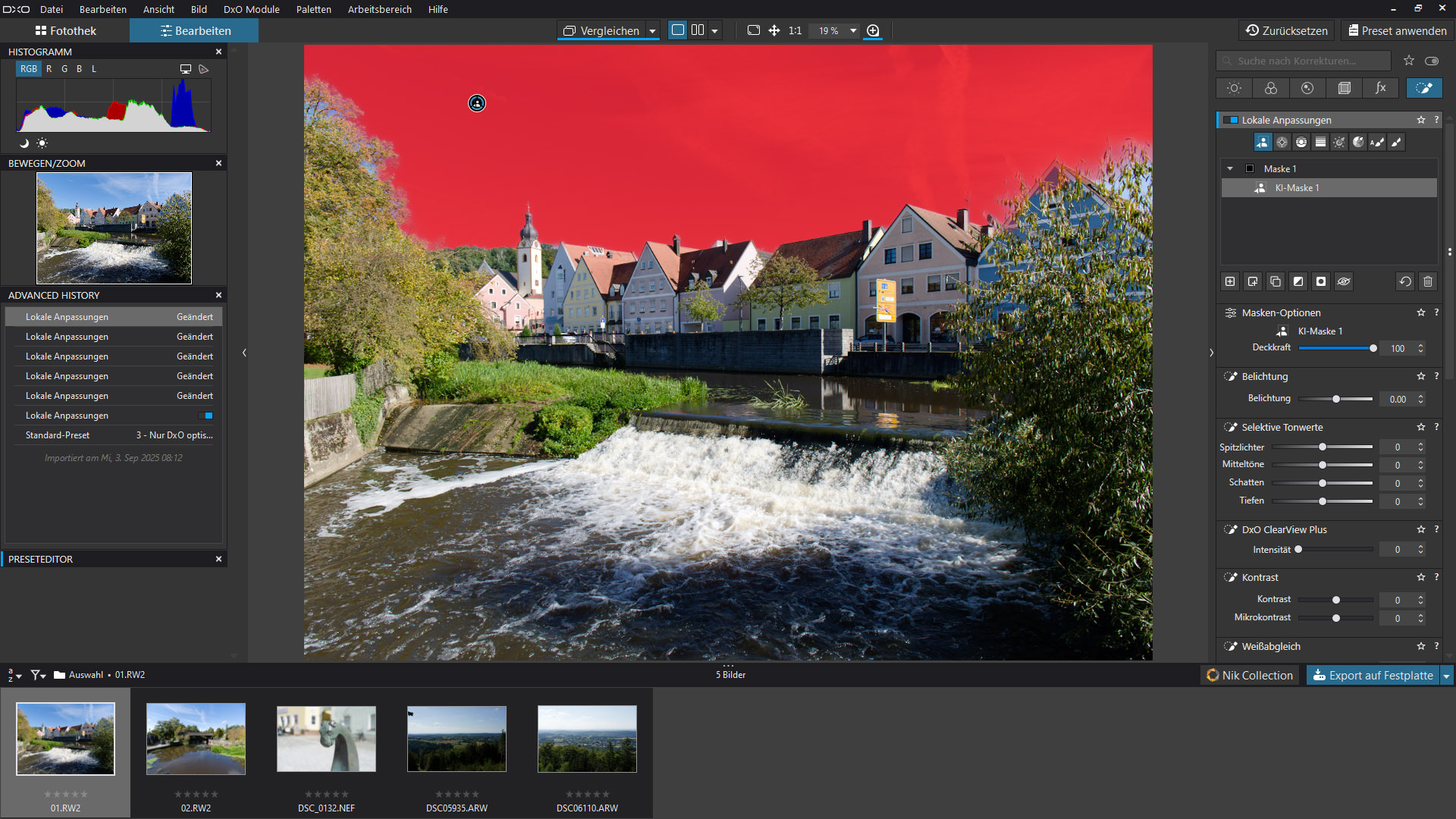 Als weitere Neuerung bringt DxO PhotoLab 9 lokale Anpassungen für die Rauschreduzierung und das Schärfen mit. Dadurch lassen sich die DeepPrime-Rauschreduzierungstechnologie und die Optimierung der Objektivschärfe gezielt lokal einsetzen und können Fotos noch effektiver entrauscht sowie nachgeschärft werden. Die Auswahl der zu bearbeitenden Bildbereiche ist natürlich auch mittels der KI-Masken möglich.