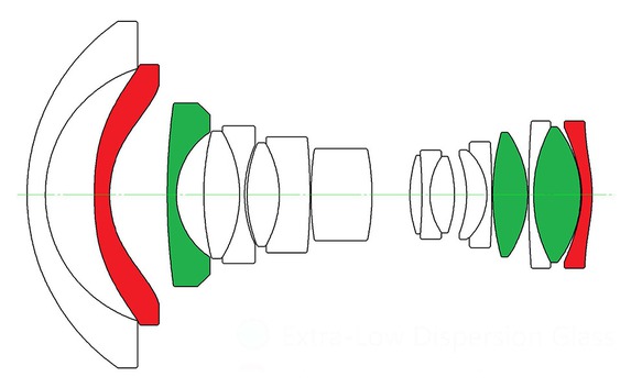 An den genannten Mittelformatkameras ist die Korrektur allerdings nur um maximal acht Millimeter möglich, an Vollformatkameras sind es elf Millimeter. Die kleinbildäquivalente Brennweite fällt mit rund 12mm an Mittelformatkameras extrem kurz aus, an Vollformatkameras sind es 15mm. Zum optischen Aufbau gehören 17 Linsen in elf Gruppen, drei ED- und zwei asphärische Linsen reduzieren Abbildungsfehler.