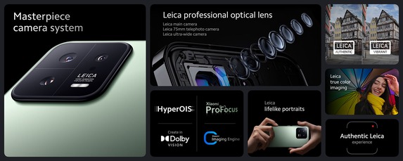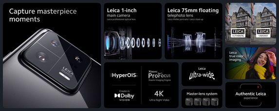 Das Xiaomi 13 bringt eine Triple-Kamera mit sehr ähnlichen Brennweiten mit, die Sensoren sind jedoch kleiner. Bei der Hauptkamera des Smartphones wird ein Sony IMX800 (1/1,49 Zoll-Klasse) mit 50 Megapixel verwendet, durch Pixel-Binning (4-in-1 Super Pixel) lässt sich die Kantenlänge der Pixel auf 2µm vergrößern. Die Auflösung liegt dann bei 12,5 Megapixel. Das Objektiv mit 23mm KB-Brennweite und einer Blende von F1,8 ist stabilisiert. Bei der Ultraweitwinkelkamera handelt es sich um einen 1/3,06-Zoll-Sensor mit zwölf Megapixel, das 15mm-Objektiv (KB-äquivalent) verfügt über eine Lichtstärke von F2,2. Teleaufnahmen speichert ein 10-Megapixel-Sensor der 1/3,75-Zoll-Klasse. Die Brennweite der optisch stabilisierten F2-Optik liegt bei umgerechnet 75mm.