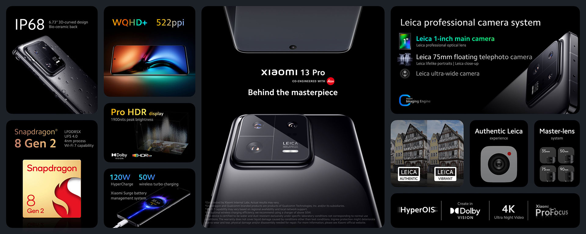 Das größte der neuen Smartphones ist das Xiaomi 13 Pro. Hier ist ein 6,73 Zoll großes AMOLED-Panel mit 3.200 x 1.440 Pixel verbaut. Das Xiaomi 13 verfügt über ein 6,36 Zoll messendes AMOLED-Display mit 2.400 x 1.800 Pixel. Das Xiaomi Lite ist mit einem 6,55 Zoll messendem AMOLED-Panel mit ebenfalls 2.400 x 1.080 Pixel ausgerüstet. Alle drei Displays arbeiten mit bis zu 120 Hz, Gorilla Glass Victus schützt das Panel des 13 Pro, beim 13 und 13 Lite nutzt Xiaomi Gorilla Glass 5.