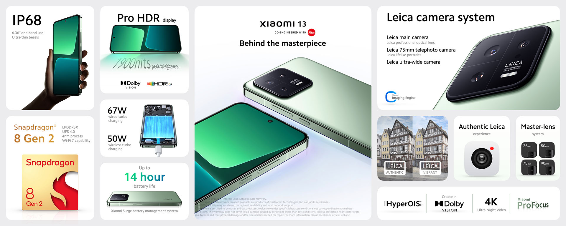 Der SoC des Xiaomi 13 Pro und Xiaomi 13 ist identisch, es handelt sich um einen Qualcomm Snapdragon 8 Gen 2 mit acht Kernen und Adreno 740-GPU. Beim 13 Lite greift Xiaomi auf einen Qualcomm Snapdragon 7 Gen 1 mit Adreno 644 zurück. Arbeitsspeicher besitzt das Flaggschiff 12GB, die beiden anderen Geräte müssen mit 8GB auskommen. Der nicht erweiterbare Festspeicher ist beim 13 Pro und 13 256GB groß, beim 13 Lite sind es 128GB.
