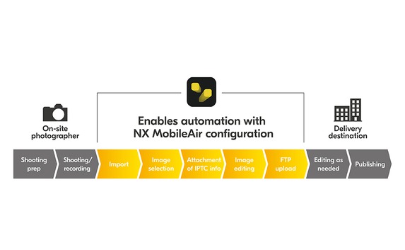 Bei NX Mobile Air handelt es sich um eine App für Mobilgeräte. Damit ist es möglich, die mit Nikon-Digitalkameras aufgenommenen Bilder automatisch und ohne Verwendung eines Computers auf einen FTP-Server zu übertragen. Die App soll alle Anforderungen von professionellen Fotografen erfüllen und neben einer schnellen Bildübertragung auch eine hohe Zuverlässigkeit zu bieten haben. Die Aufnahmen werden per USB von der Kamera zum Mobilgerät übertragen und können von dort aus kabellos an den Server gesendet werden.