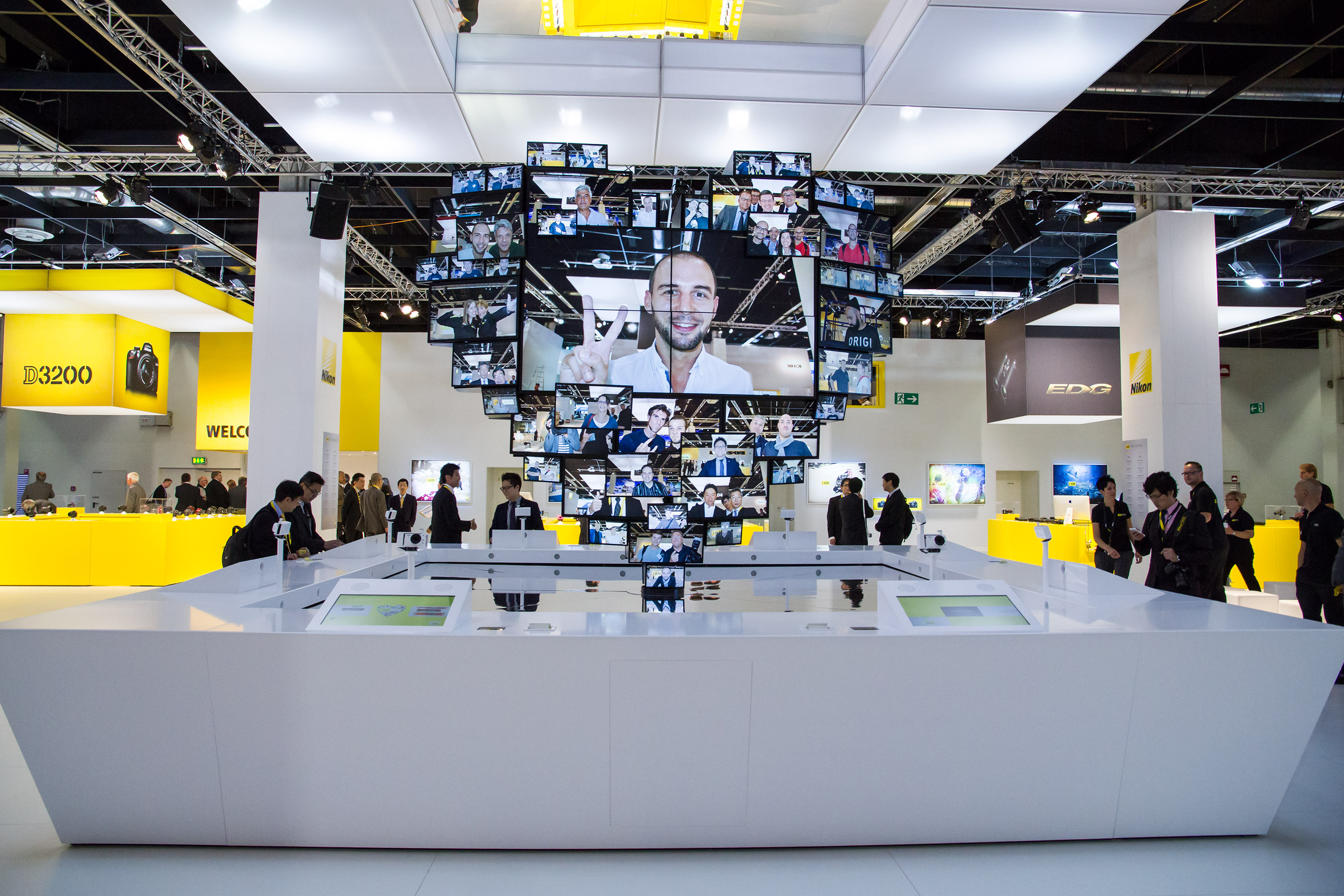 Wer einmal „Teil“ des Nikon-Standes sein will, kann am südlichen Eingang Fotos von sich aufnehmen lassen und an ein großes Herz aus vielen Bildschirmen, das mitten auf dem Nikon-Stand steht, senden.