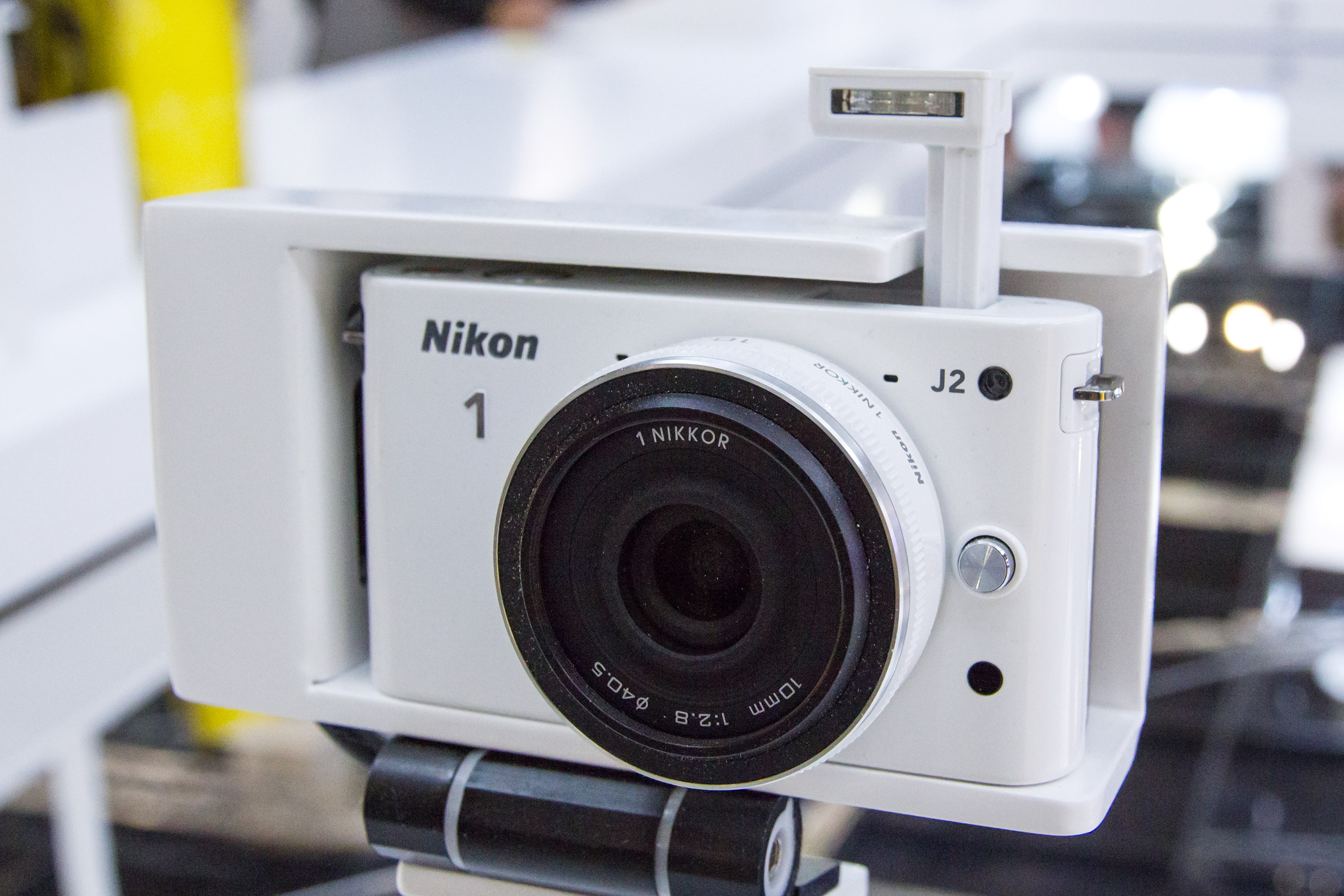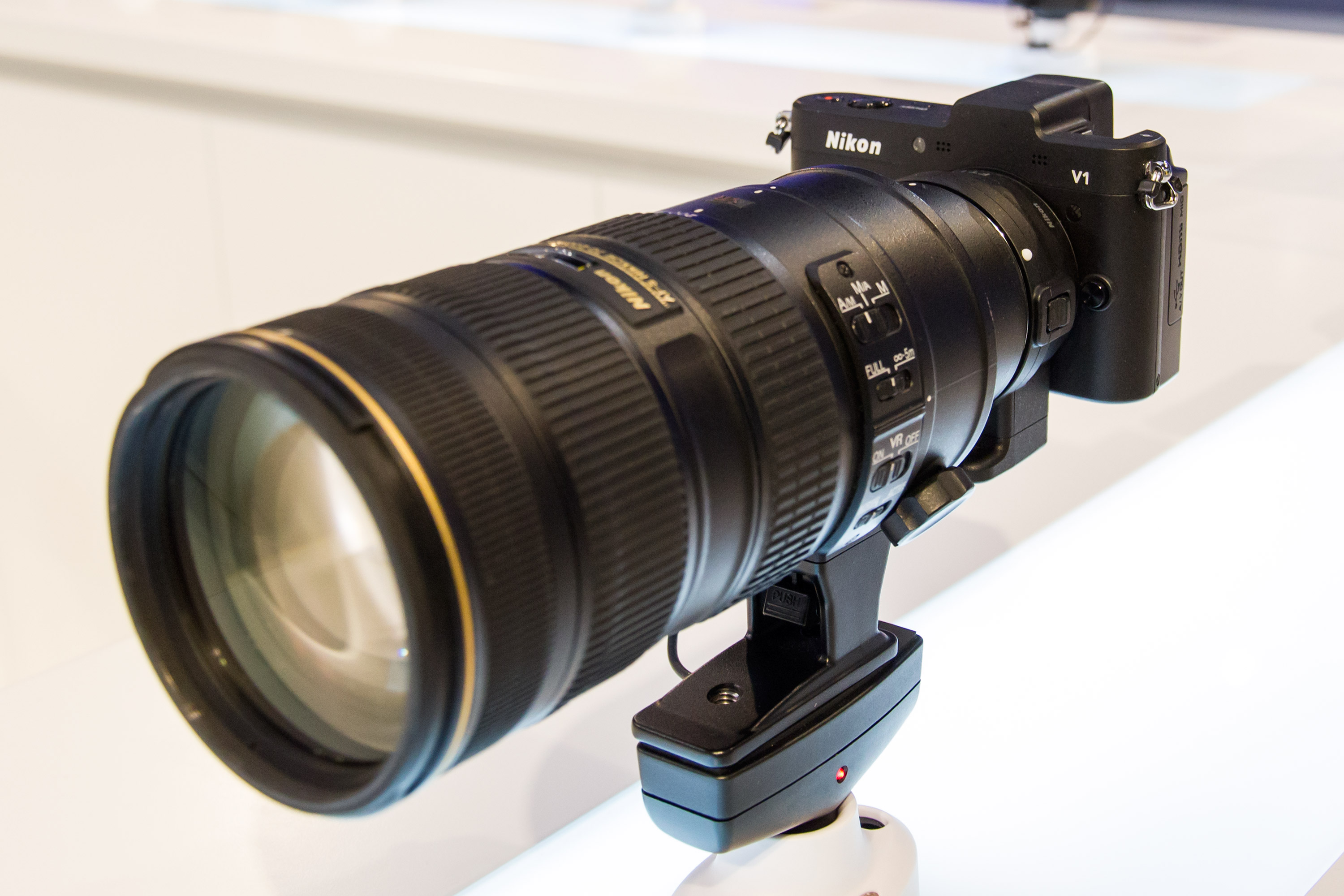 Die spiegellosen Nikon-1-Modelle, darunter die neue Nikon 1 J2, durften am Stand von Nikon natürlich auch nicht fehlen. Neben den Nikkor-1-Objektiven zeigte Nikon auch ungewöhnlichere Kamera-Objektiv-Kombinationen. Dank Objektiv-Adapter lassen sich an den Nikon-1-Kameras alle Nikkor-Objektive verwenden und vergrößern damit das Objektiv-Portfolio für Nikon-1-Systemkameras deutlich. Wie sinnvoll der Einsatz eines großen Teleobjektivs, in diesem Fall eines Nikkor AF-S70-200mm F2,8, an einer kleinen Systemkamera wie der Nikon 1 ist, sei dabei einmal außen vor gelassen. Das Handling dieser Kombination ist – und das ist natürlich nicht verwunderlich – „leicht“ Objektiv-lastig.