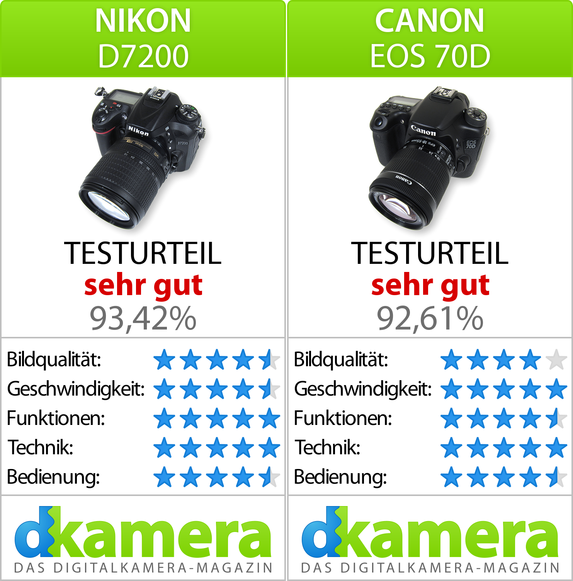 und der Canon EOS 70D hat gezeigt, dass beide Kameramodelle eine gehobene Ausstattung besitzen und grundsätzlich recht ähnlich ausfallen. Insgesamt gesehen hat jedoch die D7200 die Nase vorne, denn in den meisten unserer Bewertungspunkte hat sie ein klein wenig mehr zu bieten. Ihre Aufnahmen zeigen bei Tag etwas mehr Details, bei Nacht ist das Bildrauschen im direkten Vergleich ein wenig schwächer. Das Kameragehäuse fällt durch den Einsatz von Magnesium zudem hochwertiger aus, abgedichtet sind allerdings beide Kameras.