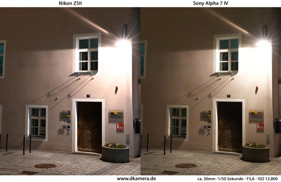 Bei Nacht ist die höhere Auflösung ebenfalls gut zu erkennen. Auch hier sind die Aufnahmen der Sony Alpha 7 IV detailreicher. Das Bildrauschen fällt bei der Kamera von Sony etwas höher aus, dies ist aber auf eine etwas niedrigere Rauschreduzierung der Sony-DSLM zurückzuführen. Für beide Kameras gilt, dass auch bei sehr hohen Sensorempfindlichkeiten noch eine gute Qualität erzielt wird. Bei dem von uns zum Test verwendeten ISO-Wert 12.800 sind natürlich Qualitätsabstriche hinzunehmen, dies ist aber absolut normal.