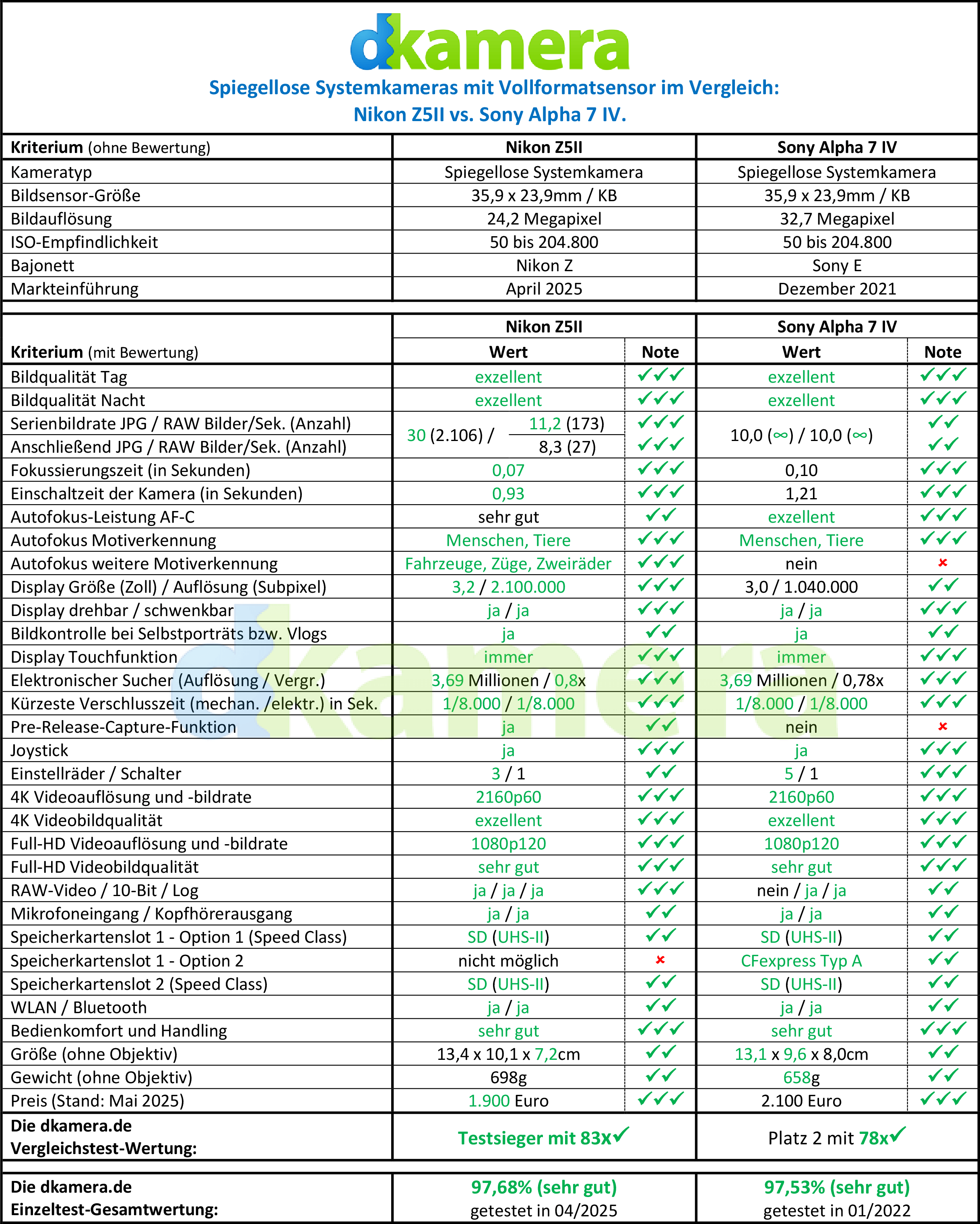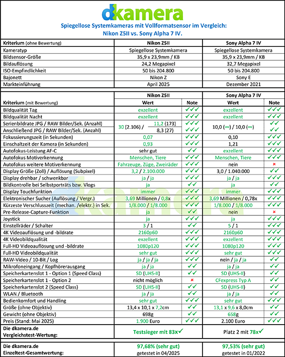 Mit der Nikon Z5II und der Sony Alpha 7 IV lassen sich zwei Kameras mit Vollformatchip erwerben, die als vergleichsweise günstige Modelle dem Einsteiger-Segment zuzuordnen sind. Das Wort "Einsteiger" sollte man dabei aber nicht unbedingt wörtlich nehmen, um zwei einfache Low-Budget-DSLMs handelt es sich keineswegs. Stattdessen um spiegellose Systemkameras, die den vergleichsweise günstigen Einstieg in die Vollformat-Liga ermöglichen. In diesem Vergleich schauen wir uns die wichtigsten Daten der beiden DSLMs an und gehen auf ihre Stärken und Schwächen ein.