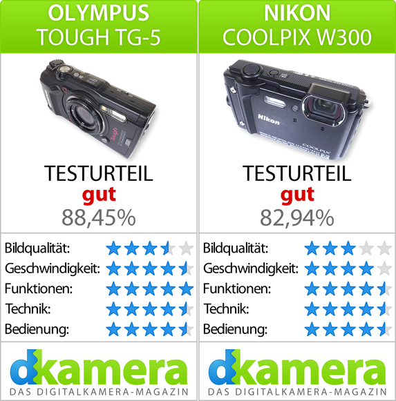 Bei der Bildqualität sehen wir die Olympus TOUGH TG-5 in Front: Bei Tag zeigt die Nikon Coolpix W300 zwar einen Tick mehr Details, bei Nacht wird jedoch ein störendes Rauschen sichtbar. Die höhere Auflösung ihres Sensors von rund vier Megapixel wird praktisch nicht sichtbar. Dank der RAW-Aufnahme hat die TG-5 sogar zusätzliche Bearbeitungsreserven zu bieten. Bei der Outdoorkamera überzeugt uns zudem das Objektiv mehr: Es deckt zwar einen etwas kleineren Brennweitenbereich ab, ist aber lichtstärker. Außerdem bildet es an den Bildrändern recht scharf ab. Bei der Coolpix W300 fällt die Randunschärfe wesentlich stärker aus.
