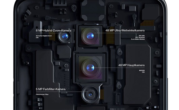 Bei der Hauptkamera des 8 Pro greift OnePlus auf einen IMX-689-Sensor von Sony zurück. Dieser gehört zur 1/1,4-Zoll-Klasse und löst 48 Megapixel auf. Allzu viele Daten sind zu diesem Sensor nicht bekannt, er soll jedoch "Dual Native ISO" unterstützen und einen omnidirektionalen Phasen-AF bieten. Ersteres Feature sollte bei höheren ISO-Stufen für weniger Rauschen sorgen, der omnidirektionale Phasen-AF soll das treffsichere und schnelle Scharfstellen bei wenig Licht ermöglichen. In puncto Sensorgröße hält der Chip nicht ganz mit den Kameras von Samsung oder Huawei mit, er ist aber trotzdem deutlich größer als die allermeisten Smartphone-Sensoren am Markt. Die Brennweite des Objektivs liegt bei 25mm (KB), die Blende bei F1,7. Verwacklungen reduziert ein optischer Stabilisator.
