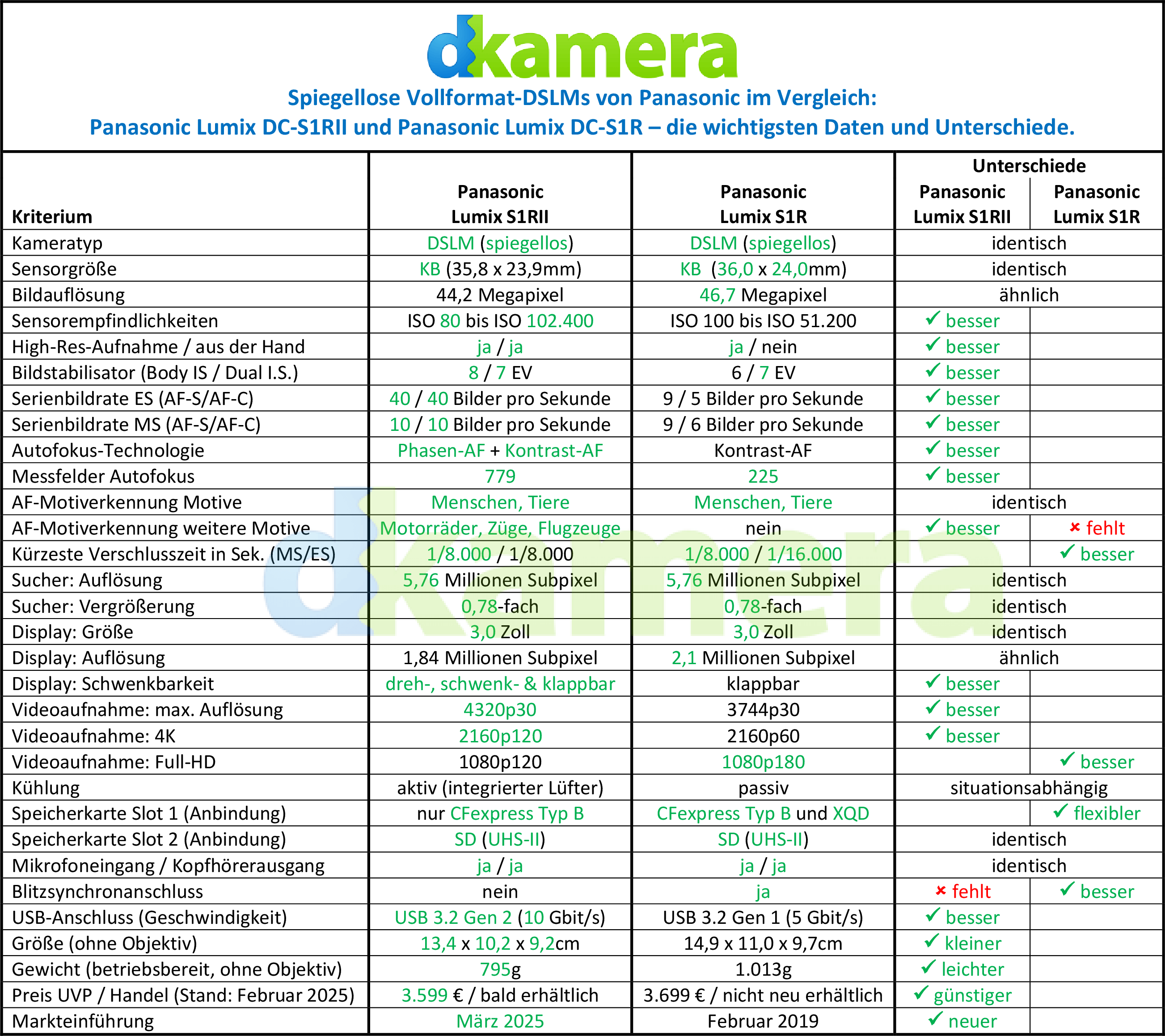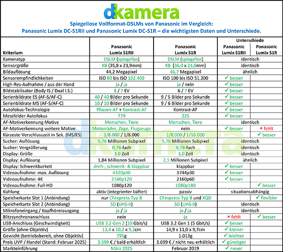 Sechs Jahre nach der Vorstellung der Lumix DC-S1R hat Panasonic mit der Lumix DC-S1RII deren Nachfolgemodell angekündigt. Da es in dieser langen Zeit einige technologische Verbesserungen gegeben hat, fällt der Unterschied zwischen beiden spiegellosen Systemkameras entsprechend groß aus. In diesem Vergleich gehen wir auf die wichtigsten Unterschiede der beiden DSLMs ein.
