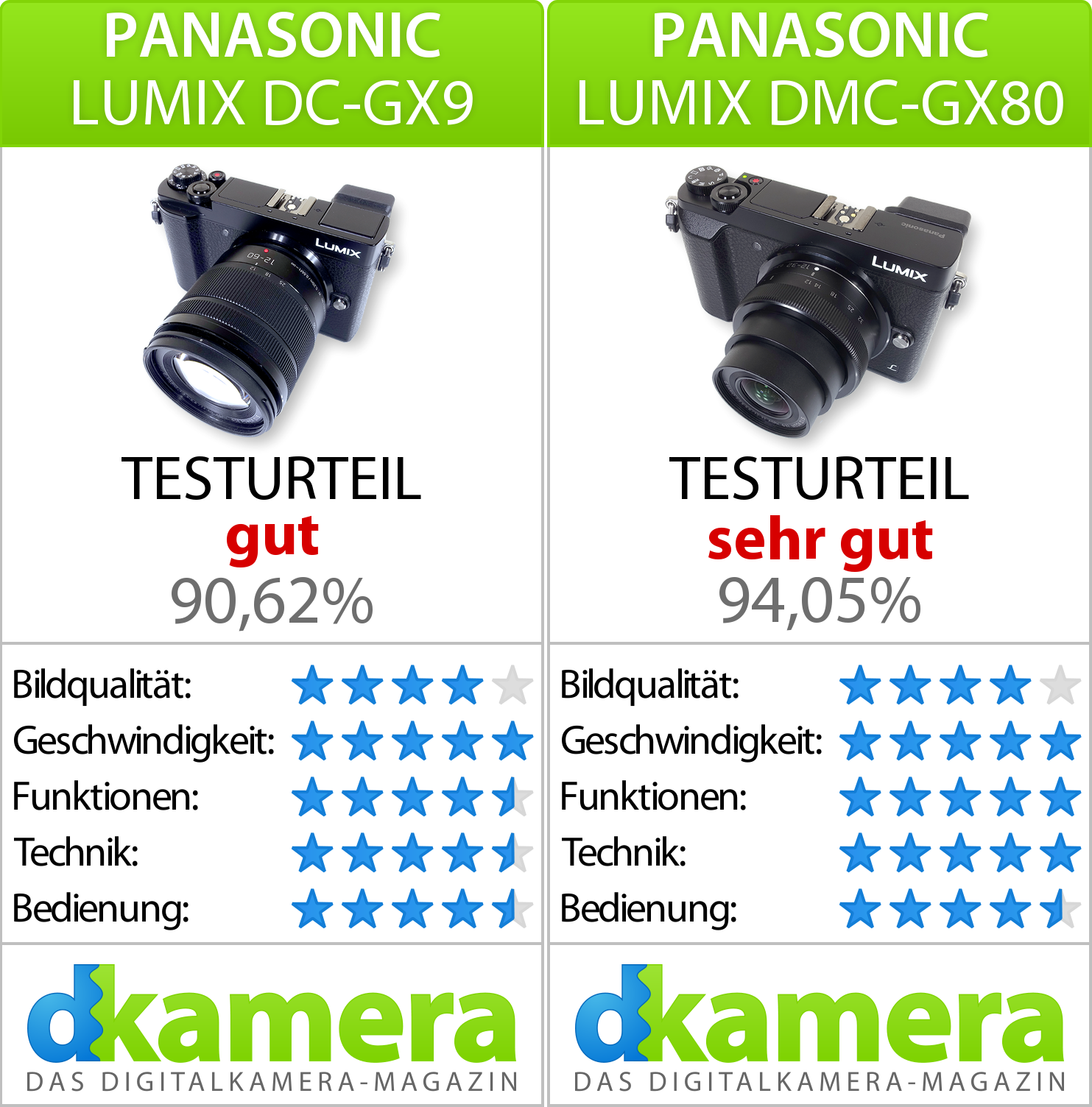Bitte beachten Sie bei den Einzeltests, dass diese zu unterschiedlichen Zeitpunkten erfolgt sind. Die GX9 wurde als neueres Modell mit einem neueren Bewertungsschema getestet, weshalb die Bewertungen nicht direkt miteinander verglichen werden können.