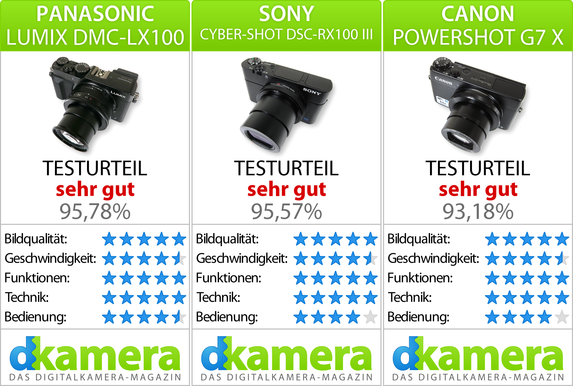 Am Ende bleibt festzuhalten: Alle drei Kameramodelle haben sehr viel zu bieten, die Panasonic Lumix DMC-LX100 aber am meisten. Diese passt allerdings leider nicht mehr in eine Hosentasche, weshalb die kaum schlechtere RX100 III für Freunde von sehr kompakten Modellen ebenfalls eine sehr gute Wahl darstellt. Die G7 X hat ebenfalls viel zu bieten, mit der LX100 und der RX100 III kann sie durch den fehlenden Sucher und die etwas zurückliegende Bildqualität aber nicht ganz mithalten. Dafür ist sie mit Abstand am günstigsten zu erwerben.
