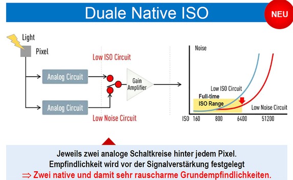 Dieses Feature wird durch den Einsatz von zwei Schaltkreisen („Low ISO“ und „Low Noise“) ermöglicht. Ersterer arbeitet von ISO 160 bis ISO 800, Letzterer ab ISO 800. Ein schnelleres Auslesen des Sensors reduziert bei der GH5s zudem den Rolling-Shutter-Effekt.