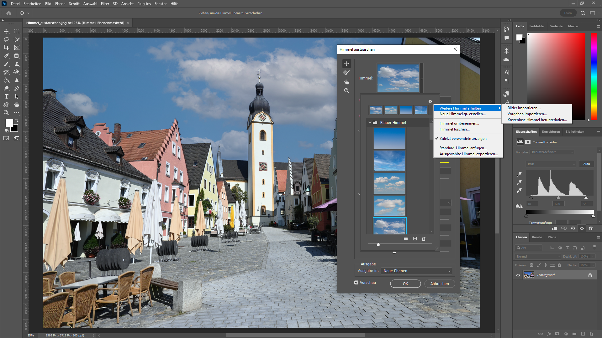 Weitere Himmel können bei Adobe heruntergeladen oder selbst hinzugefügt werden: