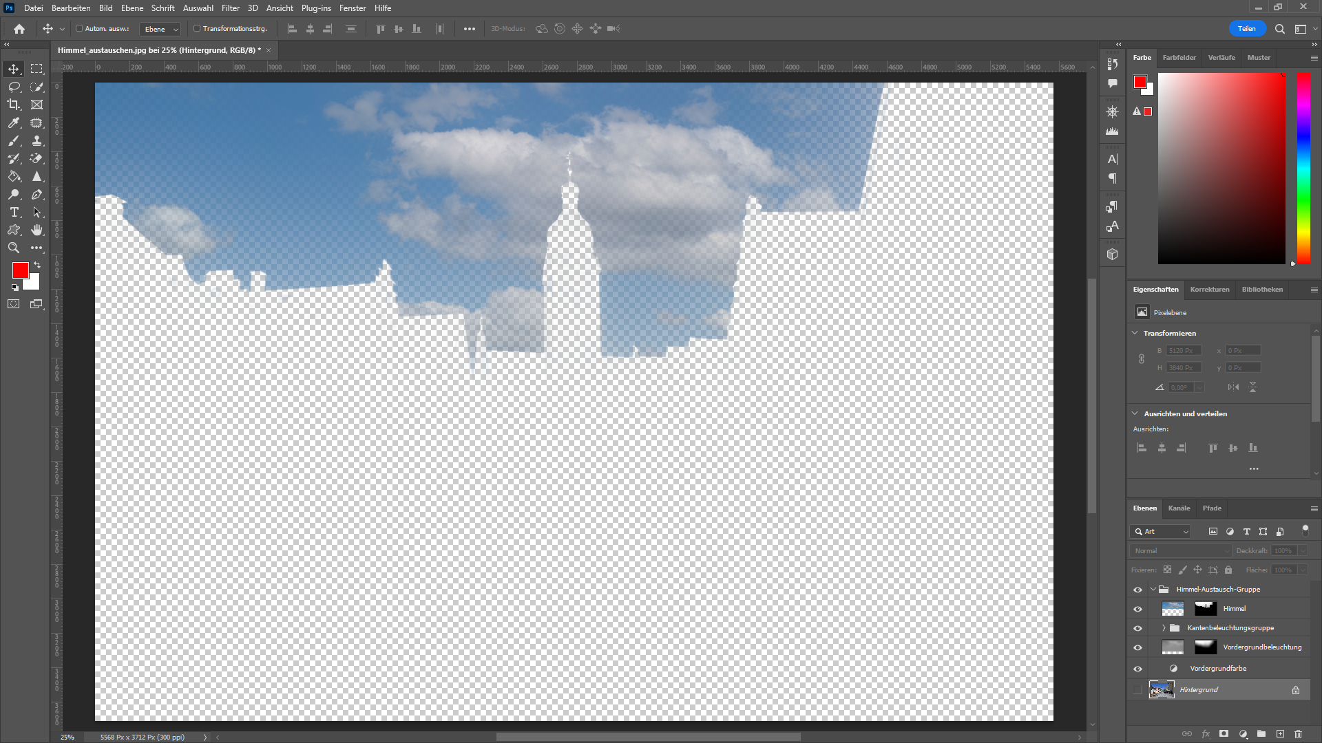 Zunächst haben wir ein Standardbild von unseren Beispielaufnahmen verwendet. Hier ist der Himmel sehr blau und wolkenlos, klare Kanten machen das Maskieren trotz vieler Details vergleichsweise leicht. Getauscht haben wir den Himmel in diesem Fall gegen einen Himmel mit Wolken.