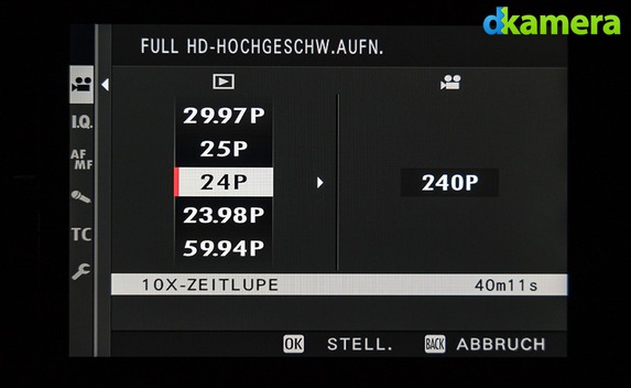 verbessert. Das gilt jedoch vor allem für die Full-HD-Aufnahme. Hier wurde eine neue Zeitlupenoption eingeführt. Dank einer maximalen Bildrate von 240 Vollbildern pro Sekunde speichert die DSLM bis zu 10-fache Zeitlupen. Hier hält keine andere Fotokamera am Markt mit. Die Bildqualität der Aufnahmen bewegt sich zwar sichtbar unter der Qualität von herkömmlichen Full-HD-Aufnahmen, fällt für 240 Vollbilder pro Sekunde aber zweifellos sehr gut aus.